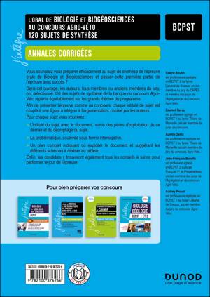 Comment se préparer efficacement au sujet de synthèse de l'épreuve orale de Biologie et Biogéosciences et passer cette première partie de l'épreuve avec succès ? Dans cet ouvrage, les auteurs, tous membres ou anciens membres du jury, ont sélectionné 120 des sujets de synthèse de la banque des concours Agro-Véto répartis équitablement sur les grands thèmes du programme. Afin de présenter l'épreuve comme au concours, chaque intitulé de sujet est couplé à une figure à intégrer à l'argumentation, choisie par les auteurs. Chaque sujet est présenté sur deux pages. Sur la première, l'intitulé du sujet avec la figure à intégrer, suivis des pistes d'exploitation proposées par les auteurs. Au verso, le sujet est décrypté, la problématique est soulevée et un focus est fait sur les erreurs à éviter. Un plan complet est proposé avec les indications des moments où la figure est à exploiter ainsi que des différents schémas à réaliser. Enfin, les candidats à l'oral y trouveront également tous les conseils à suivre pour performer à l'oral le jour de l'épreuve.