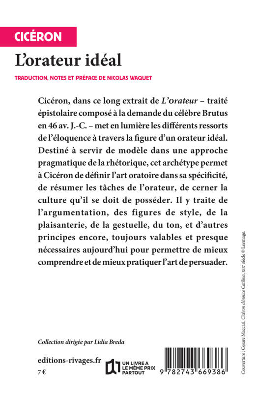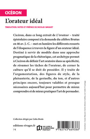Cicéron, dans ce long extrait de «L'Orateur» - traité épistolaire composé à la demande du célèbre Brutus en 46 av. J.-C. - met en lumière les différents ressorts de l'éloquence à travers la figure d'un orateur idéal. Destiné à servir de modèle dans une approche pragmatique de la rhétorique, cet archétype permet à Cicéron de définir l'art oratoire dans sa spécificité, de résumer les tâches de l'orateur, de cerner la culture qu'il se doit de posséder. Il y traite de l'argumentation, des figures de style, de la plaisanterie, de la gestuelle, du ton, et d'autres principes encore, toujours valables et presque nécessaires aujourd'hui pour permettre de mieux comprendre et de mieux pratiquer l'art de persuader.
