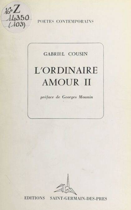 Gabriel Cousin traite le thème de l’amour avec une simplicité grave, une émouvante humanité, un accent fervent et généreux. Cette poésie directe, ouverte à tous, nullement hermétique (ce qui n’exclut pas les plus subtiles recherches) captivera plus d’un amoureux : il y entendra la musique de son cœur. La réédition, aujourd’hui, de L’Ordinaire Amour version 1958, augmentée du double de textes : L’Ordinaire Amour, version 1981, poursuit le chant de ce que Gabriel Cousin nomme « la région connue mais inexplorée du couple ». « Il s’agit vraiment d’un tout, comme l’avoue d’ailleurs le titre : la rencontre, la naissance du désir, l’amour du couple, les grossesses, le travail et les fatigues dans le rapport au couple, les maladies, la mort, les enfants qui grandissent, la puberté, la fuite des enfants du foyer. Puis les parents vieillissant. Un face-à-face émouvant, vrai, avec les coups de pioche du temps, de rares brouilles, un autre désir pernicieux parfois, aussi. Mais il faut voir la discipline imposée, la puissance de la bonté, l’imaginaire si bien partagé à deux, fait rarissime. Cousin est l’interprète du couple dans sa vérité. La préface précise de Georges Mounin dit bien ce qu’il apporte à la poésie contemporaine. On n’a jamais parlé du désir respectueux, voire violent, entre époux ainsi, ni vu les enfants ainsi racontés par le père. Un beau livre, d’une rare unité. » Jean Breton.