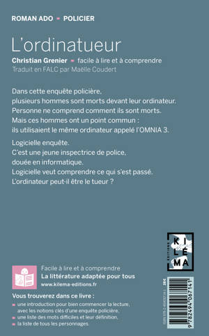UN LIVRE FACILE À LIRE ET À COMPRENDRE Dans cette enquête policière, plusieurs hommes sont morts devant leur ordinateur. Personne ne comprend comment ils sont morts. Mais ces hommes ont un point commun : ils utilisaient le même ordinateur appelé l'OMNIA 3. Logicielle enquête. C'est une jeune inspectrice de police, douée en informatique. Logicielle veut comprendre ce qui s'est passé. L'ordinateur peut-il être le tueur ? *** Découvrez ce classique de la littérature policière pour ado, enfin accessible à toutes et tous !