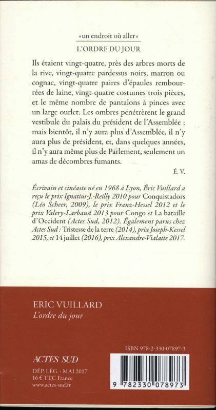 Ils étaient vingt-quatre, près des arbres morts de la rive, vingt-quatre pardessus noirs, marron ou cognac, vingt-quatre paires d'épaules rembourrées de laine, vingt-quatre costumes trois pièces, et le même nombre de pantalons à pinces avec un large ourlet. Les ombres pénétrèrent le grand vestibule du palais du président de l'Assemblée ; mais bientôt, il n'y aura plus d'Assemblée, il n'y aura plus de président, et, dans quelques années, il n'y aura même plus de Parlement, seulement un amas de décombres fumants. Eric Vuillard