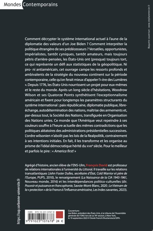 Cet ouvrage éclaire le système international actuel, inlassablement façonné par les États-Unis depuis Wilson et Roosevelt, et la sortie de l’isolationnisme. Il développe l’idée selon laquelle les Quatorze Points du 8 janvier 1918 constituent la boussole de la politique étrangère de Washington jusqu’à aujourd’hui. Largement idéaliste et pétrie de l’exceptionnalisme des pères fondateurs, cette diplomatie se heurte aux réalités de l’histoire contemporaine. Au départ opposée aux principes du congrès de Vienne (équilibre des puissances, stabilité hégémonique), sa stratégie en reprend toutefois les logiques imparables au service de la consolidation de la puissance américaine. Analysant l’« ère des Lumières » (la nôtre, s’étendant des révolutions du XVIIIe siècle à la présidence de Joe Biden), François David démontre que les États-Unis ont forgé la plus performante des alliances entre la Realpolitik et l’idéalisme, malgré des contradictions, en particulier le rôle à accorder au multilatéralisme institutionnalisé (SDN, ONU). Paradoxalement, l’Europe devient aujourd’hui plus wilsonienne que Wilson, annonçant un XXIe siècle wilsonien, mais pas nécessairement américain.