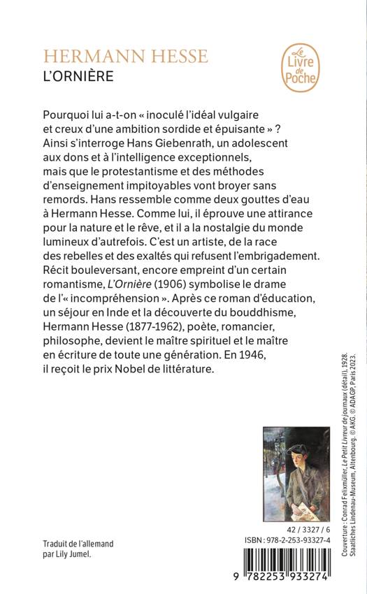 Pourquoi lui avait-on « inoculé l'idéal vulgaire et creux d'une ambition sordide et épuisante » ? Ainsi s'interroge le héros de Hermann Hesse, Hans Giebenrath, un adolescent aux dons et à l'intelligence exceptionnels mais que le protestantisme et des méthodes d'enseignement impitoyables et orgueilleuses vont broyer sans remords. Hans ressemble comme deux gouttes d'eau à l'écrivain. Comme lui, il éprouve une attirance pour la nature, l'évasion et le rêve, et la nostalgie du monde lumineux d'autrefois. C'est un artiste. Il est aussi de la race des rebelles et des exaltés qui refusent l'embrigadement, l'insertion forcée dans un cadre de vie. Récit bouleversant et pathétique, encore empreint d'un certain romantisme, L'Ornière (1906) symbolise le drame et la détresse de l'« incompréhension ». Après ce grand et tragique roman d'éducation, après un séjour en Inde et la découverte du bouddhisme, Hermann Hesse (1877-1962), poète, romancier, philosophe, deviendra le maître spirituel et le maître en écriture de toute une génération. En 1946, il avait reçu le prix Nobel de littérature.