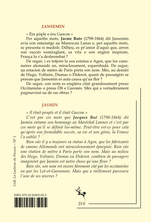 « Il était peuple et il était Gascon ». C’est par ces mots que Jacques Boé (1798-1864) dit Jasmin entame son hommage au Maréchal Lannes et c’est par ces mots qu’il se définit lui-même. Peut-être est-ce pour cela qu’après son formidable succès, sa vie et son génie, la France l’a oublié ? Bien sûr il y a toujours sa statue à Agen, que les fabricants de canons Allemands ont miraculeusement épargnée. Bien sûr une station de métro à Paris porte son nom. Mais au milieu des Hugo, Voltaire, Dumas ou Diderot, combien de passagers imaginent que Jasmin est autre chose qu’une fleur ? Bien sûr, son nom est encore fièrement cité par les occitanistes ou les Lot-et-Garonnais. Mais qui a réellement parcouru l’une de ses œuvres ?
