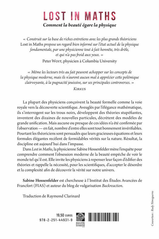 Dans Lost in Maths, la physicienne Sabine Hossenfelder mène l’enquête pour comprendre comment l’obsession moderne de la beauté nous empêche de voir le monde tel qu’il est. Aveuglés par l’élégance mathématique, les physiciens ont développé des théories stupéfiantes, inventé des dizaines de nouvelles particules, décrété des modèles de grande unification. Mais aucune ou presque de ces idées n’a été confirmée par l’observation — en fait, beaucoup d’entre elles sont tout bonnement invérifiables. En dépit de ces contradictions, les théoriciens sont persuadés que leurs gracieuses équations et leurs formules élégantes recèlent de formidables vérités sur la nature. Et du fait de ces théories « trop belles pour ne pas être vraies », la discipline est aujourd’hui dans l’impasse.