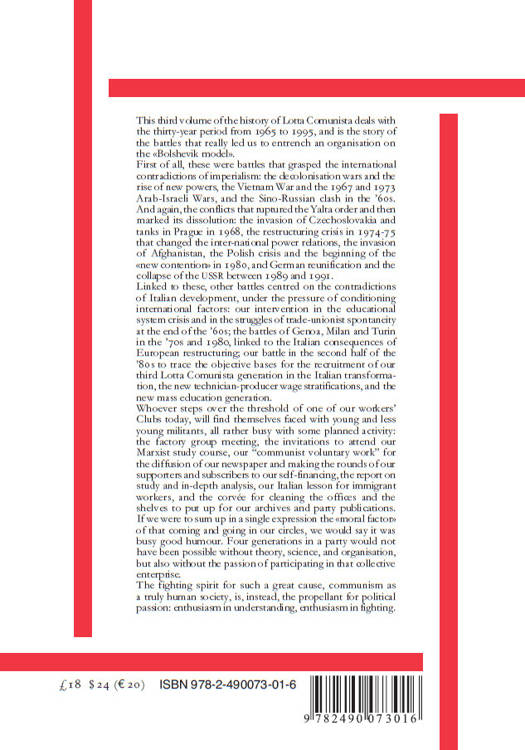 This third volume of the history of Lotta Comunista deals with the thirty-year period from 1965 to 1995, and is the story of the battles that really led us to entrench an organisation on the «Bolshevik model». First of all, these were battles that grasped the international contradictions of imperialism: the decolonisation wars and the rise of new powers, the Vietnam War and the 1967 and 1973 Arab-Israeli Wars, and the Sino-Russian clash in the ’60s. And again, the conflicts that ruptured the Yalta order and then marked its dissolution: the invasion of Czechoslovakia and tanks in Prague in 1968, the restructuring crisis in 1974-75 that changed the inter-national power relations, the invasion of Afghanistan, the Polish crisis and the beginning of the «new contention» in 1980, and German reunification and the collapse of the USSR between 1989 and 1991. Linked to these, other battles centred on the contradictions of Italian development, under the pressure of conditioning international factors: our intervention in the educational system crisis and in the struggles of trade-unionist spontaneity at the end of the ’60s; the battles of Genoa, Milan and Turin in the ’70s and 1980, linked to the Italian consequences of European restructuring; our battle in the second half of the ’80s to trace the objective bases for the recruitment of our third Lotta Comunista generation in the Italian transforma-tion, the new technician-producer wage stratifications, and the new mass education generation. Whoever steps over the threshold of one of our workers’ Clubs today, will find themselves faced with young and less young militants, all rather busy with some planned activity: the factory group meeting, the invitations to attend our Marxist study course, our “communist voluntary work” for the diffusion of our newspaper and making the rounds of our supporters and subscribers to our self-financing, the report on study and in-depth analysis, our Italian lesson for immigrant workers, and the corvée for cleaning the offices and the shelves to put up for our archives and party publications. If we were to sum up in a single expression the «moral factor» of that coming and going in our circles, we would say it was busy good humour. Four generations in a party would not have been possible without theory, science, and organisation, but also without the passion of participating in that collective enterprise. The fighting spirit for such a great cause, communism as a truly human society, is, instead, the propellant for political passion: enthusiasm in understanding, enthusiasm in fighting.