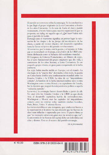 "A partir de la experiencia de la fábrica, de la guerra, de la lucha partisana en el Norte de Italia, un grupo de obreros se cimienta en la construcción de un partido de clase. Los problemas son muchos y las condiciones difíciles. Había muchas nieblas en Europa y en el mundo en aquellos años. Dominaban la ideología de la guerra fría y el mito de la URSS estalinista disfrazado como baluarte del socialismo mundial. La idea de un "imperialismo unitario", la bandera de la lucha internacionalista tanto contra Washington como contra Moscú y su capitalismo de Estado fue la elección que aseguró la independencia política a aquella reducida "patrulla". Pero Washington y Moscú no eran las únicas capitales del imperialismo. En Asia el desarrollo capitalista hervía de contradicciones y también estaban Londres, Paris, Bonn y Roma. Haber hecho bien las cuentas con las fuerzas que actuaban en aquel entonces permitió a aquellos obreros de no ser instrumento de la luchas de otros y de volver a construir una fuerte organización para la defensa de los trabajadores. Reflexionar hoy sobre aquellos resultados es útil. Los últimos años han sido los peores desde la transición como evolución de los sueldos en España. Sería necesaria y consideramos también posible una mejor defensa. Y Hay que hacer bien las cuentas con las fuerzas del mercado mundial, con Europa, Berlín, Bruselas y Fránkfurt".