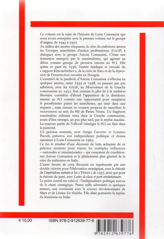 Ce volume est la suite de l’histoire de Lotta Comunista que nous avons entreprise avec le premier volume sur le groupe d’origine, de 1943 à 1952. Au milieu des années cinquante, la crise du stalinisme amena les Groupes anarchistes d’action prolétarienne (GAAP) à dialoguer avec le groupe Azione Comunista. C’était une formation marquée par le maximalisme, qui agissait au début comme groupe de pression interne au PCI. Elle quitta ce parti en 1956, l’année fatidique et cruciale du « rapport Khrouchtchev », de la crise de Suez et de la répres- sion de l’insurrection ouvrière en Hongrie. L’essentiel de la parabole d’Azione Comunista s’effectua en quelques années, entre 1955 et 1958, en passant par son adhésion, avec les GAAP, au Mouvement de la Gauche communiste en 1957. Son courant le plus lié à la tradition libertaire considéra d’abord l’apparition de la dissidence interne au PCI comme une opportunité pour remplacer le prosélytisme parmi les anarchistes, qui était dans une impasse ; mais ensuite ce courant proposa de transférer le mouvement au sein du PSI de Pietro Nenni. Un fragment maximaliste milanais resta dans la Gauche communiste, avant d’être rattrapé, un peu plus tard, par le mythe maoïste. La majeure partie de l’effectif réintégra le PCI ou finit dans la passivité. Un peloton restreint, avec Arrigo Cervetto et Lorenzo Parodi, préserva son indépendance politique et donna naissance à Lotta Comunista en 1965. Ce fut le résultat d’une décennie de lutte acharnée de ce peloton restreint pour rejeter les multiples influences – nationales et internationales – qui essayaient de condition- ner Azione Comunista et le phénomène plus général de la crise du stalinisme en Italie. L’autre facette de cette décennie est représentée par une double victoire pour l’élaboration stratégique, avec la théorie de l’impérialisme unitaire et les « Thèses » de 1957, ainsi que pour la théorie du parti, avec Luttes de classe et parti révolutionnaire. Le point central est celui-ci : l’indépendance politique autour de la clarté stratégique. Parmi mille adversités et quelques erreurs, une continuité avec la science révolutionnaire de Marx et de Lénine fut rétablie. Elle allait permettre la reprise du léninisme en Italie.
