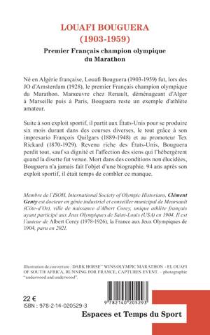 Né en Algérie française, Louafi Bouguera (1903-1959) fut, lors des JO d’Amsterdam (1928), le premier Français champion olympique du Marathon. Manoeuvre chez Renault, déménageant d’Alger à Marseille puis à Paris, Bouguera reste un exemple d’athlète amateur. Suite à son exploit sportif, il partit aux États-Unis pour se produire six mois durant dans des courses diverses, le tout grâce à son impresario François Quilgars (1889-1948) et au promoteur Tex Rickard (1870-1929). Revenu riche des États-Unis, Bouguera perdit tout, sauf sa dignité et l’affection des siens qui l’hébergèrent quand la disette fut venue. Mort dans des conditions non élucidées, Bouguera n’a jamais fait l’objet d’une biographie. 94 ans après son exploit sportif, il était temps de combler ce manque.