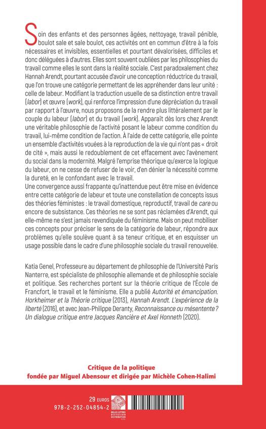 Soin des enfants et des personnes âgées, nettoyage, travail pénible, boulot sale et sale boulot, ces activités ont en commun d’être à la fois nécessaires et invisibles, essentielles et pourtant dévalorisées, difficiles et donc déléguées à d’autres. Elles sont souvent oubliées par les philosophies du travail comme elles le sont dans la réalité sociale. C’est paradoxalement chez Hannah Arendt, pourtant accusée d’avoir une conception réductrice du travail, que l’on trouve une catégorie permettant de les appréhender dans leur unité : celle de labeur. Modifiant la traduction usuelle de sa distinction entre travail (labor) et oeuvre (work), qui renforce l’impression d’une dépréciation du travail par rapport à l’oeuvre, nous proposons de la rendre plus littéralement par le couple du labeur (labor) et du travail (work). Apparaît dès lors chez Arendt une véritable philosophie de l’activité posant le labeur comme condition du travail, lui-même condition de l’action. À l’aide de cette catégorie, elle pointe un ensemble d’activités vouées à la reproduction de la vie qui n’ont pas « droit de cité », mais aussi le redoublement de cet effacement avec l’avènement du social dans la modernité. Malgré l’emprise théorique qu’exerce la logique du labeur, on ne cesse de refuser de le voir, d’en dénier la nécessité comme la dureté, en le confondant avec le travail.