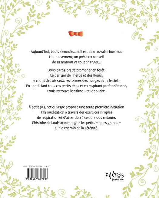 Aujourd'hui, Louis s'ennuie… et il est de mauvaise humeur. Heureusement, un précieux conseil de sa maman va tout changer Louis part alors se promener en forêt. Le parfum de l’herbe et des fleurs, le chant des oiseaux, les formes des nuages dans le ciel… En appréciant tous ces petits riens et en respirant profondément, Louis retrouve le calme… et le sourire. À petit pas, cet ouvrage propose une toute première initiation à la méditation à travers des exercices simples de respiration et d’attention à ce qui nous entoure. L’histoire de Louis accompagne les petits – et les grands – sur le chemin de la sérénité.