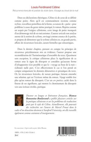 Dans ses déclarations théoriques, Céline n'a de cesse de se définir comme un poète. Alors qu'il est communément reconnu comme styliste, travailleur pointillieux de la forme, sa nature de "poète" pose problème à cause du genre même pratiqué par l'auteur polémiste : le roman. Bianca Romaniuc-Boularand articule son analyse autour de la notion de rythme, envisagé comme l'essence de la poésie, afin de démontrer que le rythme célinien est, en grande partie, affaire de récurrences lexicales, autant formelles que sémantiques.