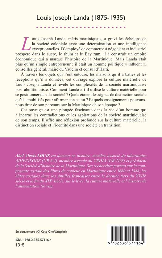 Louis Joseph Landa, métis martiniquais, a gravi les échelons de la société coloniale avec une détermination et une intelligence exceptionnelles. D'employé de commerce à négociant et industriel prospère dans le sucre, le rhum et le Bay rum, il a construit un empire économique qui a marqué l'histoire de la Martinique. Mais Landa était plus qu'un simple entrepreneur: il était un homme politique influent, conseiller général, maire du Vauclin et consul d'Haïti. À travers les objets qui l'ont entouré, les maisons qu'il a bâties et les réceptions qu'il a données, cet ouvrage explore la culture matérielle de Louis Joseph Landa et révèle les complexités de la société martiniquaise post-abolitionniste. Comment Landa a-t-il utilisé la culture matérielle pour se positionner dans la société ? Quels étaient les signes de distinction sociale qu'il a mobilisés pour affirmer son statut ? Et quels enseignements pouvons-nous tirer de son parcours sur la Martinique de son époque ? Cet ouvrage est une plongée fascinante dans la vie d'un homme qui a incarné les contradictions et les aspirations de la société martiniquaise de son temps. Il offre une réflexion profonde sur la culture matérielle, la distinction sociale et l'identité dans une société en transition.