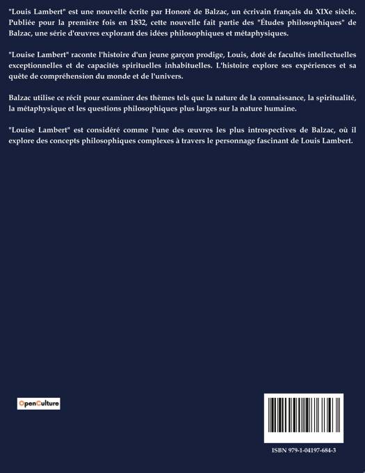 "Louis Lambert" est un roman d'Honoré de Balzac qui explore la vie intérieure et les luttes d'un jeune prodige intellectuel. Le récit commence par l'arrivée de Louis Lambert au collège de Vendôme, où il est rapidement perçu comme un élève exceptionnel en raison de son intelligence précoce et de son appétit insatiable pour la lecture. Cependant, son génie n'est pas reconnu par ses professeurs, et il souffre des rigueurs de la vie scolaire, qui étouffent son esprit créatif. Lambert est un penseur novateur, fasciné par les mystères de l'existence et les questions métaphysiques. Il développe une amitié étroite avec le narrateur, qui partage ses intérêts intellectuels et devient son confident. Ensemble, ils explorent des idées philosophiques et spirituelles, bien que Lambert soit souvent perdu dans ses pensées, ce qui lui vaut des punitions fréquentes. Le roman met en lumière les défis auxquels sont confrontés les esprits brillants dans un système éducatif rigide et souligne la solitude et l'incompréhension que ressentent ceux qui sont en avance sur leur temps. À travers le personnage de Lambert, Balzac examine les tensions entre le génie individuel et les contraintes sociales, tout en offrant une réflexion sur la nature de la pensée et de la créativité.