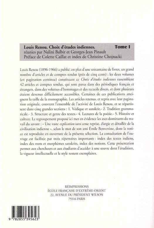 Louis Renou (1896-1966) a publié, en plus d’une soixantaine de livres, un grand nombre d’articles et de comptes rendus (près de cinq cents) ; les deux volumes (en pagination continue) constituant ce Choix d’études indiennes rassemblent 42 articles et comptes rendus, qui sont parus dans des périodiques français et étrangers, dans des volumes d’hommages et des recueils divers, et dont plusieurs étaient devenus difficilement accessibles. Certaines de ces publications atteignent la taille de la monographie. Les articles retenus, et repris avec leur pagination originale, couvrent l’ensemble de l’activité de Louis Renou, et se répartissent dans cinq grandes sections : 1. Védique et sanskrit. – 2. Tradition grammaticale. – 3. Structure et genre des textes. – 4. Lectures de la poésie. – 5. Histoire et culture. Le regroupement proposé ici met en évidence les axes dominants du travail du savant : « Une vaste explication sans cesse reprise, élargie et détaillée de la civilisation indienne », selon le mot de son Émile Benveniste, dont la notice est reproduite en ouverture de la présente sélection. La consultation de l’ouvrage est facilitée par trois répertoires importants : index des textes indiens, indes des mots et morphèmes sanskrits, index des notions. Cette présentation permet aux chercheurs et aux étudiants d’accéder à une œuvre dont l’érudition, la vigueur intellectuelle et le style restent exemplaires.