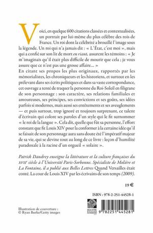 En citant ses propos les plus originaux, rapportés par les mémorialistes, les chroniqueurs et les historiens, et surtout en les prélevant dans ses écrits politiques et dans sa vaste correspondance, cet ouvrage a tenté de traquer la personne du Roi-Soleil en filigrane de son personnage : son caractère, ses relations familiales et amoureuses, ses principes, ses convictions et ses goûts, ses idées parfois si modernes, mais aussi ses entêtements et ses aveuglements — et puis surtout, trop ignoré et toujours surprenant, ce talent d’écrivain qui colore ses paroles d’un style qui le fit surnommer « le roi de la langue ». Cela dit, quelle que fût sa personne, l’effort constant que fit Louis XIV pour la conformer à la certaine idée qu’il se faisait de son personnage aura sans doute été l’impératif majeur de sa vie, qui se devine tout au long de ce livre : leçon d’humilité paradoxale à la racine d’un orgueil « solaire ».
