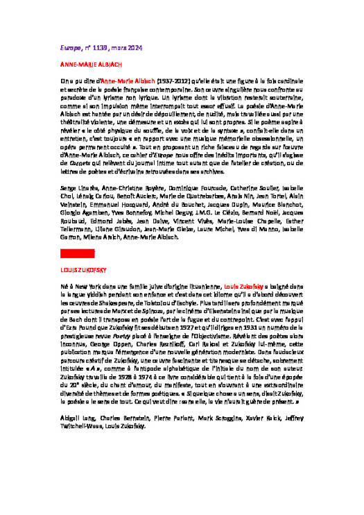 La poésie d'Anne-Marie Albiach est hantée par un désir de dépouillement, de nudité, mais travaillée aussi par une théâtralité violente, une démesure et un excès qui lui sont propres. Si le poème aspire à révéler « le côté physique du souffle, de la voix et de la syntaxe », confiait-elle dans un entretien, c est toujours « en rapport avec une musique mémorielle obsessionnelle, un opéra permanent occulté ». Tout en proposant un riche faisceau de regards sur l'oeuvre d'Anne-Marie Albiach, ce cahier d'Europe nous offre des inédits importants, qu'il s'agisse de Carnets qui relèvent du journal intime tout autant que de l'atelier de création, ou de lettres de poètes et d'écrivains retrouvées dans ses archives.