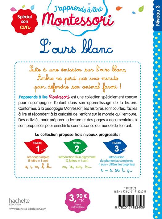 J’apprends à lire MONTESSORI est une collection spécialement conçue pour accompagner l’enfant dans son apprentissage de la lecture. Conformément à la pédagogie Montessori, les histoires sont courtes, faciles à lire et répondent à la curiosité de l’enfant sur le monde qui l’entoure. Des activités pour préparer la lecture et des pages « documentaires » sont proposées pour enrichir la connaissance du monde de l’enfant.