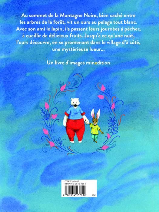 Au sommet de la Montagne Noire, bien caché entre les arbres de la forêt, vit un ours au pelage tout blanc. Avec son ami le lapin, ils passent leurs journées à pêcher, à cueillir de délicieux fruits. Jusqu’à ce qu’une nuit, l’ours découvre, en se promenant dans le village d’à côté, une mystérieuse lueur...
