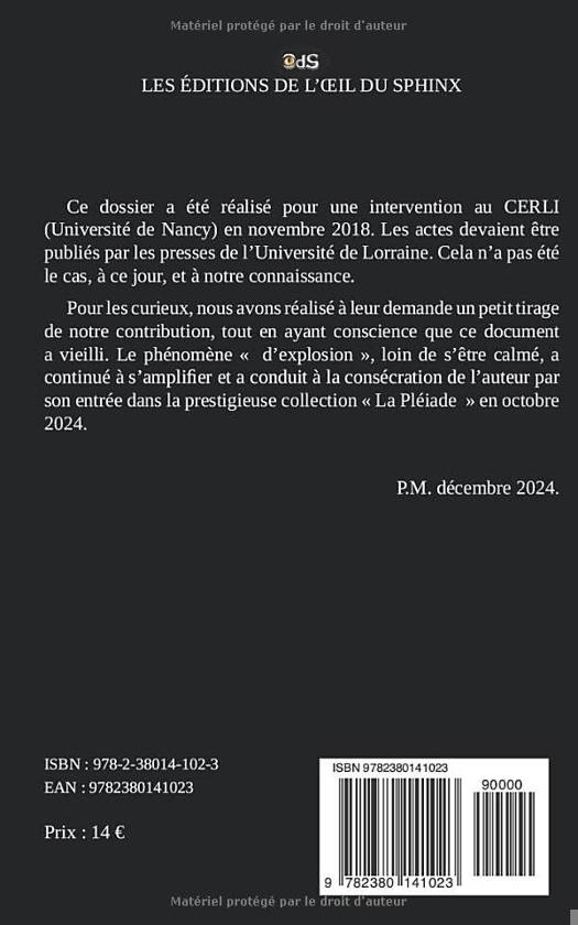 Ce dossier a été réalisé pour une intervention au CERLI (Université de Nancy) en novembre 2018. Les actes devaient être publiés par les presses de l’Université de Lorraine. Cela n’a pas été le cas, à ce jour, et à notre connaissance. Pour les curieux, nous avons réalisé à leur demande un petit tirage de notre contribution, tout en ayant conscience que ce document a vieilli. Le phénomène « d’explosion », loin de s’être calmé, a continué à s’amplifier et a conduit à la consécration de l’auteur par son entrée dans la prestigieuse collection « La Pléiade » en octobre 2024.