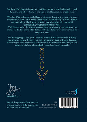 "Our beautiful planet is home to 8.7 million species. Animals that walk, crawl, fly, swim, and all of which, in one way or another, enrich our daily lives. Whether it's watching a football game with your dog, the first time your eyes meet those of a fox in the forest, or the warmth and purring provided by that cat you took in. Our lives are affected by exchanges with our animal companions, whether domestic or wild. With these comics, the author wants to show the diversity and beauty of the animal world, but above all to denounce human behaviour that we should no longer see, ever. We're not going to lie to you, these are incredibly sad stories and it is likely that some of them will touch you. But they are also stories of hope, because every tear you shed means that these animals matter to you, and that you will take care of those who are lucky enough to cross your path."