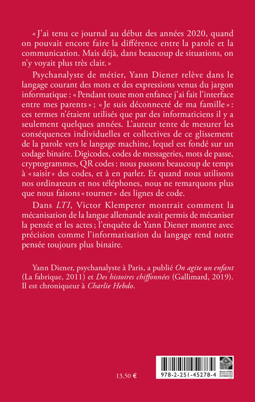 J'ai tenu ce journal au debut des annees 2020, quand on pouvait encore faire la difference entre la parole et la communication. Mais deja, dans beaucoup de situations, on n'y voyait plus tres clair. Psychanalyste de metier, Yann Diener releve dans le langage courant des mots et des expressions venus du jargon informatique: Pendant toute mon enfance j'ai fait l'interface entre mes parents; Je suis deconnecte de ma famille ces termes n'etaient utilises que par des informaticiens il y a seulement quelques annees. L'auteur tente de mesurer les consequences individuelles et collectives de ce glissement de la parole vers le langage machine, lequel est fonde sur un codage binaire. Digicodes, codes de messageries, mots de passe, cryptogrammes, QR codes: nous passons beaucoup de temps a saisir des codes, et a en parler. Et quand nous utilisons nos ordinateurs et nos telephones, nous ne remarquons plus que nous faisons tourner des lignes de code. Dans LTI, Victor Klemperer montrait comment la mecanisation de la langue allemande avait permis de mecaniser la pensee et les actes; l'enquete de Yann Diener montre avec precision comme l'informatisation du langage rend notre pensee toujours plus binaire.