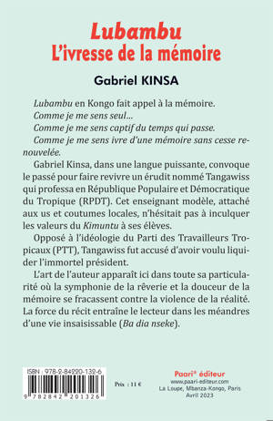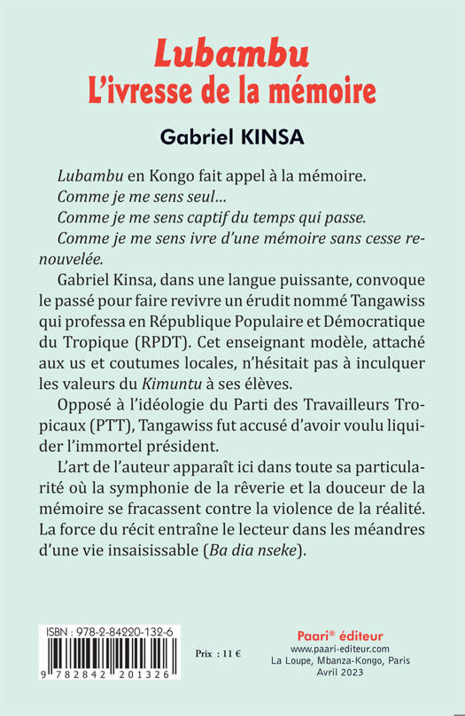 Lubambu en Kongo fait appel à la mémoire. Comme je me sens seul… Comme je me sens captif du temps qui passe. Comme je me sens ivre d’une mémoire sans cesse renouvelée. Gabriel Kinsa, dans une langue puissante, convoque le passé pour faire revivre un érudit nommé Tangawiss qui professa en République Populaire et Démocratique du Tropique (RPDT). Cet enseignant modèle, attaché aux us et coutumes locales, n’hésitait pas à inculquer les valeurs du Kimuntu à ses élèves. Opposé à l’idéologie du Parti des Travailleurs Tropicaux (PTT), Tangawiss fut accusé d’avoir voulu liquider l’immortel président. L’art de l’auteur apparaît ici dans toute sa particularité où la symphonie de la rêverie et la douceur de la mémoire se fracassent contre la violence de la réalité. La force du récit entraîne le lecteur dans les méandres d’une vie insaisissable (Ba dia nseke).