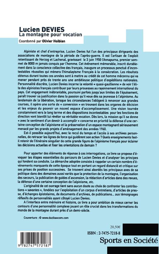 Alpiniste et chef d'entreprise, Lucien Devies fut l'un des principaux dirigeants des associations de montagne de la période de l'après-guerre. Il est artisan de l'exploit retentissant de Herzog et Lachenal, gravissant le 3 juin 1950 l'Annapurna, premier sommet de 8000 m jamais conquis par l'homme. Entre mémoire et histoire, cet ouvrage s'efforce de mieux cerner cette personnalité complexe qui a joué un rôle crucial dans les transformations du monde de la montagne durant près d'un demi siècle.
