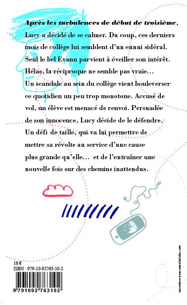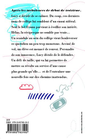 Après les turbulences de début de troisième, Lucy a décidé de se calmer. Du coup, ces derniers mois de collège lui semblent d’un ennui sidéral. Seul le bel Evann parvient à éveiller son intérêt. Hélas, la réciproque ne semble pas vraie… Un scandale au sein du collège vient bouleverser ce quotidien un peu trop monotone. Accusé de vol, un élève est menacé de renvoi. Persuadée de son innocence, Lucy décide de le défendre. Un défi de taille, qui va lui permettre de mettre sa révolte au service d’une cause plus grande qu’elle… et l’entraîner une nouvelle fois sur des chemins inattendus.