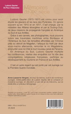 Ludovic Gaurier (1875-1931) est connu pour avoir étudié les glaciers et les lacs des Pyrénées. On ignore souvent qu'en 1915 et en 1917, il est chargé, par le ministère des Affaires étrangères et par le Touring-Club, de deux missions de propagande française en Amérique du Sud et aux Antilles. Grâce à ses carnets, ses photographies, nous pouvons suivre ses traversées maritimes entre Bordeaux et l'Amérique du Sud, les tempêtes affrontées par l'Oronsa près du détroit de Magellan, l'attaque du Haïti par deux sous-marins allemands, remonter le rio Magdalena, emprunter avec le Chile le tout nouveau canal de Panama. En Amérique du Sud, Ludovic Gaurier multiplie les conférences, réalise des enquêtes sur le rôle des congrégations religieuses françaises, participe au développement du tourisme en France et aux Antilles. C'est un autre regard qui est porté par cet ouvrage sur la Première Guerre mondiale.