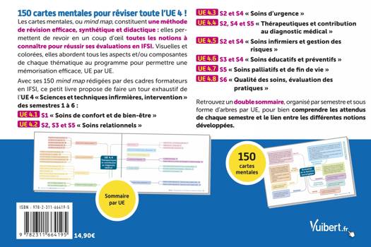 Avec ses 150 mind map rédigées par des cadres formateurs en IFSI, ce petit livre tout en couleurs propose de faire un tour exhaustif de l’UE 4 « Sciences et techniques infirmières - Interventions » des semestres 1 à 6 :