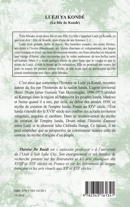L’agent territorial Henri Drum (alias Gustave Van Herreweghe, 1898-19??) résidait au Katanga dans la région où habitaient les peuples lunda, tshokwe et lwena quand il a mis, par écrit, au début des années 1930, ce mythe de création de l’empire lunda. Dans sa reconstruction du mythe de création de l’empire lunda, Drum relate l’histoire d’amour entre Luéji et le chasseur luba Chibinda Ilunga. Ce faisant, il ne peut empêcher que sa perspective de colonisateur nuance celle du conteur du mythe d’origine d’un peuple.