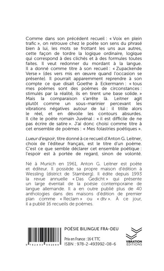 Lueur d’espoir, titre donné à ce recueil d’Anton G. Leitner, choix de l’éditeur français, est le titre d’un poème. C’est ce que semble déclarer cet ensemble poétique : l’espoir est à portée de regard, sinon de volonté.