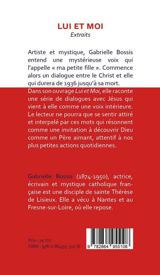Artiste et mystique, Gabrielle Bossis entend une mystérieuse voix qui l'appelle « ma petite fille ». Commence alors un dialogue entre le Christ et elle qui durera de 1936 jusqu'à sa mort. Dans son ouvrage Lui et Moi, elle raconte une série de dialogues avec Jésus qui vient à elle comme une voix intérieure. Le lecteur ne pourra que se sentir attiré et interpelé par ces mots qui résonnent comme une invitation à découvrir Dieu comme un Père aimant, attentif à nos plus petites actions quotidiennes.