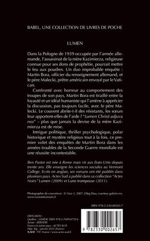 Dans la Pologne de 1939 occupée par l'armée allemande, l'assassinat de la mère Kazimierza, religieuse connue pour ses dons de prophétie, pourrait mettre le feu aux poudres. Un duo improbable enquête : Martin Bora, officier du renseignement allemand, et le père Malecki, prêtre américain envoyé par le Vatican. Confronté avec horreur au comportement des troupes de son pays, Martin Bora est tiraillé entre la loyauté et un idéal humaniste qui l'amène à apprécier la discussion, pas toujours facile, avec le père Malecki. Le couvent abrite-t-il des résistants, les soeurs leur apportent-elles de l'aide ? "Lumen Christi adjuva nos" - plus que jamais la devise de la mère Kazimierza est de mise.