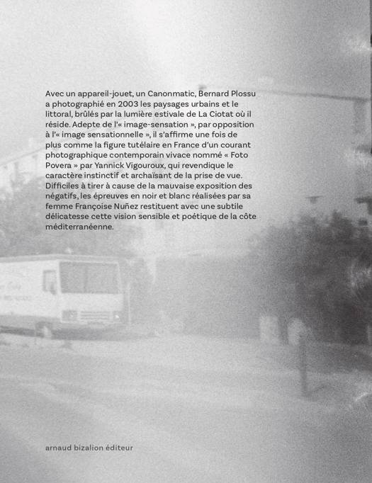 Avec un appareil-jouet, un Canonmatic, Bernard Plossu a photographié en 2003 les paysages urbains et le littoral brûlés par la lumière estivale de La Ciotat où il réside. Adepte de l’« image-sensation », par opposition à l’ « image sensationnelle », il s’affirme une fois de plus comme la figure tutélaire en France d’un courant photographique contemporain vivace nommé « Foto Povera » par Yannick Vigouroux qui revendique le caractère instinctif et archaïsant de la prise de vue. Difficiles à tirer à cause de la mauvaise exposition des négatifs, les épreuves en noir blanc réalisées par sa femme Françoise Nuñez restituent avec une subtile délicatesse cette vision sensible et poétique de la côte méditerranéenne.