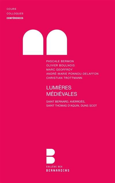 Pour sa première année universitaire au Collège des Bernardins, lieu hautement symbolique, la Faculté Notre-Dame a consacré son cycle de conférences à faire découvrir et aimer quelques éclats de la pensée médiévale. Ces conférences manifestent en particulier la manière dont l'intelligence chrétienne au Moyen Âge s'est ouverte aux philosophies de son temps, et font réfléchir aux leçons que les croyants d'aujourd'hui peuvent en tirer pour leur dialogue avec la culture et la société de leur temps. Avec Christian TROTTMANN (Bernard de Clairvaux) ; Marc GEOFFROY (Averroès) ; Pascale BERMON (Thomas d'Aquin) ; Olivier BOULNOIS (Duns Scott) ; préface d'André-Marie PONNOU-DELAFFON ; avant-propos de Frédéric LOUZEAU.