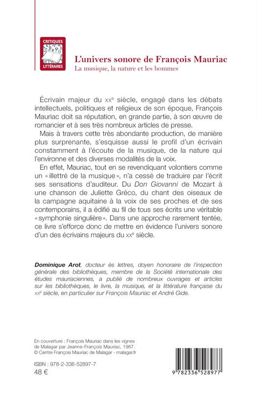 Écrivain majeur du XXe siècle, engagé dans les débats intellectuels, politiques et religieux de son époque, François Mauriac doit sa réputation, en grande partie, à son oeuvre de romancier et à ses très nombreux articles de presse. Mais à travers cette très abondante production, de manière plus surprenante, s'esquisse aussi le profil d'un écrivain constamment à l'écoute de la musique, de la nature qui l'environne et des diverses modalités de la voix. En effet, Mauriac, tout en se revendiquant volontiers comme un illettré de la musique, n'a cessé de traduire par l'écrit ses sensations d'auditeur. Du Don Giovanni de Mozart à une chanson de Juliette Gréco, du chant des oiseaux de la campagne aquitaine à la voix de ses proches et de ses contemporains, il a édifié au fil de tous ses écrits une véritable symphonie singulière . Dans une approche rarement tentée, ce livre s'efforce donc de mettre en évidence l'univers sonore d'un des écrivains majeurs du XXe siècle.