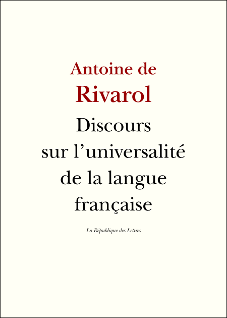 Texte intégral révisé suivi d'une biographie d'Antoine de Rivarol. "Ce qui n'est pas clair n'est pas français", disait Rivarol. D'où vient le génie particulier de la langue française ? Qu'est-ce qui l'a rendu universelle ? Pourquoi a-t-elle longtemps été la langue des diplomates, des écrivains et des philosophes ? A t-elle mérité ce pouvoir, et doit-elle encore le conserver ? Antoine de Rivarol — grammairien, homme d'esprit et de salons, conservateur caustique et anti-révolutionnaire par respect pour des institutions et des traditions productrices d'excellence langagière — s'est penché sur le sujet. Prononcé en 1783 devant l'Académie des Sciences et Belles Lettres de Berlin, son célèbre "Discours sur l'universalité de la langue française" demeure encore, deux siècles et demi plus tard, le plus brillant des essais jamais écrits sur cette Question de la langue française. Outre sa beauté littéraire, il ne peut manquer de passionner tous ceux qui aujourd'hui s'intéressent à la philologie, à la linguistique, ou aux débats contemporains sur l'orthographe, la francophonie, l'enseignement du français, et plus globalement tous les sujets relatifs au langage et à la langue française.