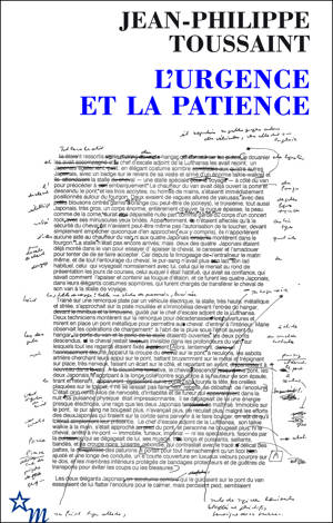 « Je conseille la lecture du recueil de textes de Toussaint L'Urgence et la Patience, en particulier à tous ceux qui rêvent d'écrire. [...] Le romancier nous révèle ses manières de procéder, ses règles, ses trucs, ses manies, les contraintes qu'il s'impose, les joies qu'il connaît, et, comme la lecture est inséparable de l'écriture, son expérience de lecteur de Proust, Kafka, Beckett, et, bien sûr, de Dostoïevski. » (Bernard Pivot, Le Journal du dimanche)