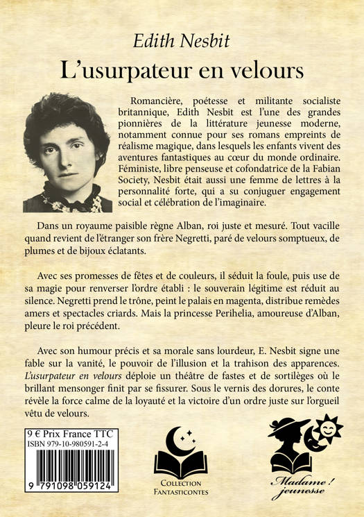 Avec son humour précis et sa morale sans lourdeur, E. Nesbit signe une fable sur la vanité, le pouvoir de l’illusion et la trahison des apparences. L’usurpateur en velours déploie un théâtre de fastes et de sortilèges où le brillant mensonger finit par se fissurer. Sous le vernis des dorures, le conte révèle la force calme de la loyauté et la victoire d’un ordre juste sur l’orgueil vêtu de velours.