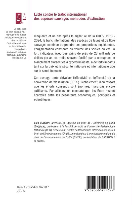 Cinquante et un ans après la signature de la CITES, 1973 - 2024, le trafic international des espèces de faune et de flore sauvages continue de prendre des proportions inquiétantes. L'augmentation constante du volume des saisies en est un fort indicateur. Avec des gains de près de 23 milliards de dollars par an, ce trafic, souvent facilité par la corruption, le blanchiment d'argent et la cybercriminalité, a de forts impacts tant sur la paix et la sécurité nationale et internationale que sur la santé humaine. Cet ouvrage tente d'évaluer l'effectivité et l'efficacité de la convention de Washington (CITES). Globalement, il en ressort que les efforts consentis sont énormes, mais pas encore suffisants. Par ailleurs, on constate que les États restent écartelés entre les pesanteurs économiques, politiques et scientifiques.