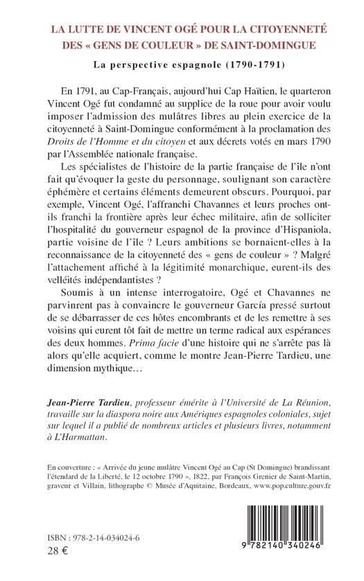 En 1791, au Cap-Français, aujourd'hui Cap Haïtien, le quarteron Vincent Ogé fut condamné au supplice de la roue pour avoir voulu imposer l'admission des mulâtres libres au plein exercice de la citoyenneté à Saint-Domingue conformément à la proclamation des Droits de l'Homme et du citoyen et aux décrets votés en mars 1790 par l'Assemblée nationale française. Les spécialistes de l'histoire de la partie française de l'île n'ont fait qu'évoquer la geste du personnage, soulignant son caractère éphémère et certains éléments demeurent obscurs. Pourquoi, par exemple, Vincent Ogé, l'affranchi Chavannes et leurs proches ont-ils franchi la frontière après leur échec militaire, afin de solliciter l'hospitalité du gouverneur espagnol de la province d'Hispaniola, partie voisine de l'île ? Leurs ambitions se bornaient-elles à la reconnaissance de la citoyenneté des gens de couleur Malgré l'attachement affiché à la légitimité monarchique, eurent-ils des velléités indépendantistes ? Soumis à un intense interrogatoire, Ogé et Chavannes ne parvinrent pas à convaincre le gouverneur García pressé surtout de se débarrasser de ces hôtes encombrants et de les remettre à ses voisins qui eurent tôt fait de mettre un terme radical aux espérances des deux hommes. Prima facie d'une histoire qui ne s'arrête pas là alors qu'elle acquiert, comme le montre Jean-Pierre Tardieu, une dimension mythique...
