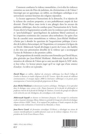 Comment combattre la violence monothéiste ? Un rabbin, un théologien catholique et un universitaire tunisien historien des religions répondent aux questions d'un agnostique. Chacun présente un diagnostic, évoque les remèdes envisagés au cours de l'histoire, analyse les succès et les échecs. En particulier, le rabbin présente l'entreprise d'humanisation de la Torah ambitionnée par le talmudisme, le théologien expose les conditions d'une lecture du texte biblique de nature à éviter les risques de dérive théocratique, l'historien tunisien décrit le climat de violence qui, selon les textes, a accompagné l'action de Mahomet et des premiers califes. De nouvelles pistes de remède sont explorées.