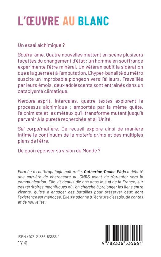 Un essai alchimique ? Soufre-âme. Quatre nouvelles mettent en scène plusieurs facettes du changement d'état: un homme en souffrance expérimente l'être minéral. Un vétéran subit la sidération due à la guerre et à l'amputation. L'hyper-banalité du métro suscite un improbable plongeon vers l'ailleurs. Travaillés par leurs émois, deux adolescents sont entraînés dans un cataclysme climatique. Mercure-esprit. Intercalés, quatre textes explorent le processus alchimique: emportés par la même quête, l'alchimiste et les métaux qu'il transforme mutent jusqu'à parvenir à la pureté recherchée et à l'Unité. Sel-corps/matière. Ce recueil explore ainsi de manière intime le continuum de la materia prima et des multiples plans de l'être. De quoi repenser sa vision du Monde ?