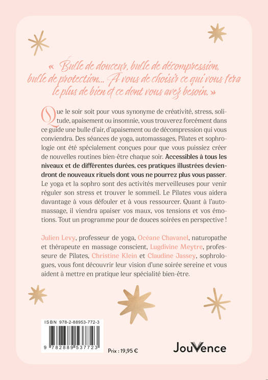 Que le soir soit pour vous synonyme de créativité, stress, solitude, apaisement ou insomnie, vous trouverez forcément dans ce guide une bulle d’air, d’apaisement ou de décompression qui vous conviendra. Des séances de yoga, automassages, Pilates et sophrologie ont été spécialement conçues pour que vous puissiez créer de nouvelles routines bien-être chaque soir. Accessibles à tous les niveaux et de différentes durées, ces pratiques illustrées deviendront de nouveaux rituels dont vous ne pourrez plus vous passer.