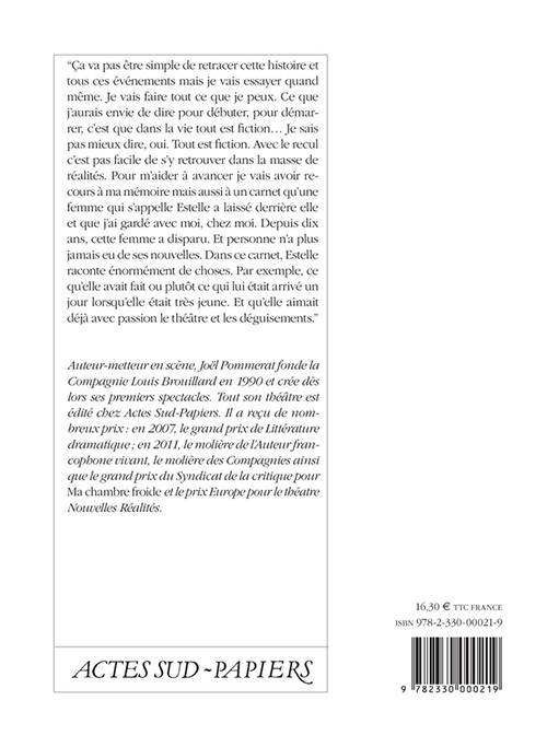 "Ca va pas être simple de retracer cette histoire et tous ces événements mais je vais essayer quand même. Je vais faire tout ce que je peux. Ce que j'aurais envie de dire pour débuter, pour démarrer, c'est que dans la vie tout est fiction... Je sais pas mieux dire, oui. Tout est fiction. Avec le recul c'est pas facile de s'y retrouver dans la masse de réalités. Pour m'aider à avancer je vais avoir recours à ma mémoire mais aussi à un carnet qu'une femme qui s'appelle Estelle a laissé derrière elle et que j'ai gardé avec moi, chez moi. Depuis dix ans, cette femme a disparu. Et personne n'a plus jamais eu de ses nouvelles. Dans ce carnet, Estelle raconte énormément de choses. Par exemple, ce qu'elle avait fait ou plutôt ce qui lui était arrivé un jour lorsqu'elle était très jeune. Et qu'elle aimait déjà avec passion le théâtre et les déguisements."