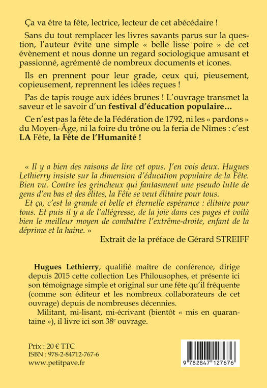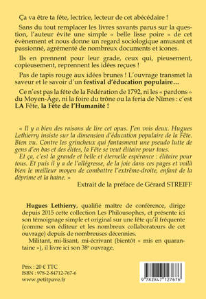 Ça va être ta fête, lectrice, lecteur de cet abécédaire ! Sans du tout remplacer les livres savants parus sur la question, l’auteur évite une simple « belle lisse poire » de cet évènement et nous donne un regard sociologique amusant et passionné, agrémenté de nombreux documents et icones. Ils en prennent pour leur grade, ceux qui, pieusement, copieusement, reprennent les idées reçues ! Pas de tapis rouge aux idées brunes ! L’ouvrage transmet la saveur et le savoir d’un festival d’éducation populaire… Ce n’est pas la fête de la Fédération de 1792, ni les « pardons » du Moyen-Âge, ni la foire du trône ou la feria de Nîmes : c’est LA Fête, la Fête de l’Humanité !