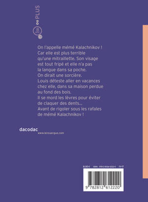 On l'appelle Mémé Kalashnikov ! Car la grand-mère de Louis est une terreur, il déteste passer des vacances dans sa maison au fond des bois, sans télé ni rien. Mais cette fois-ci, il ne va vraiment pas s'ennuyer. Car sa grand-mère, moitié sorcière moitié activiste politique, s'oppose à la construction d'une route près de chez elle. Avec son chaudron magique, sa faucille et son marteau, elle ne craint personne ! Du rire, de l'aventure et un soupçon de fantastique pour les jeunes lecteurs.