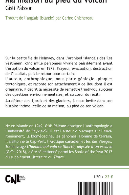 Sur la petite île de Heimaey, dans l'archipel islandais des îles Vestmann, cinq mille personnes vivaient paisiblement avant l'éruption du volcan en 1973. Frayeur, évacuation, destruction de l'habitat, puis le retour pour certains. L'auteur, anthropologue, nous parle géologie, plaques tectoniques, et nous raconte son attachement au lieu de ses origines. Il nous explique la nécessité de remettre l'individu au coeur des questions environnementales, et au coeur du récit.